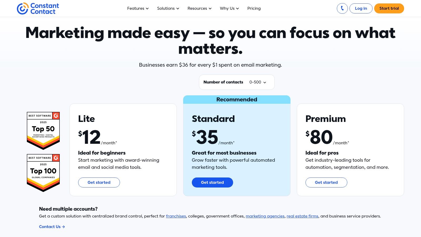 - Pricing: Starts with a 14-day or 60-day free trial. Paid plans include Lite (from $12/mo), Standard (from $35/mo), and Premium (from $80/mo), with pricing based on the number of contacts.